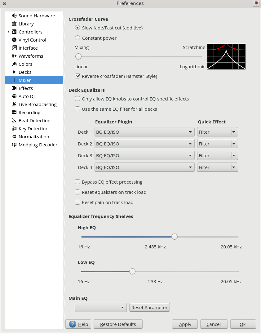 Equalizer Plugin: Here you can select the effect that is used as the mixing EQ in each deck. By default only built-in equalizers are displayed. Unchecking allows you to select any other effect.