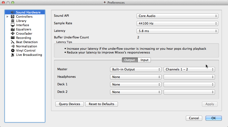 The built-in audio interface on most computers comes with a single stereo line-out and a microphone input. This can be set up with Mixxx in two ways: